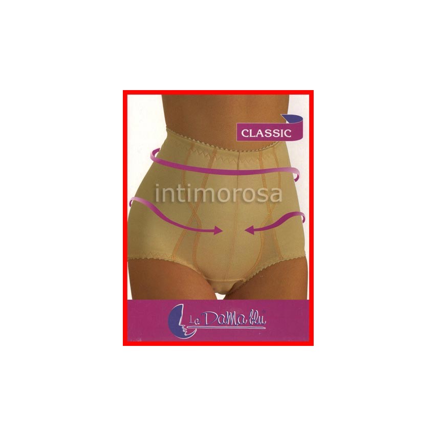 Guaina contenitiva foderata La Dama Blu 003. Tessuto elastico altamente contenitivo. Pannello centrale in maglia rigida. Cuciture anatomiche sui glutei. Rigorosamente made in Italy.