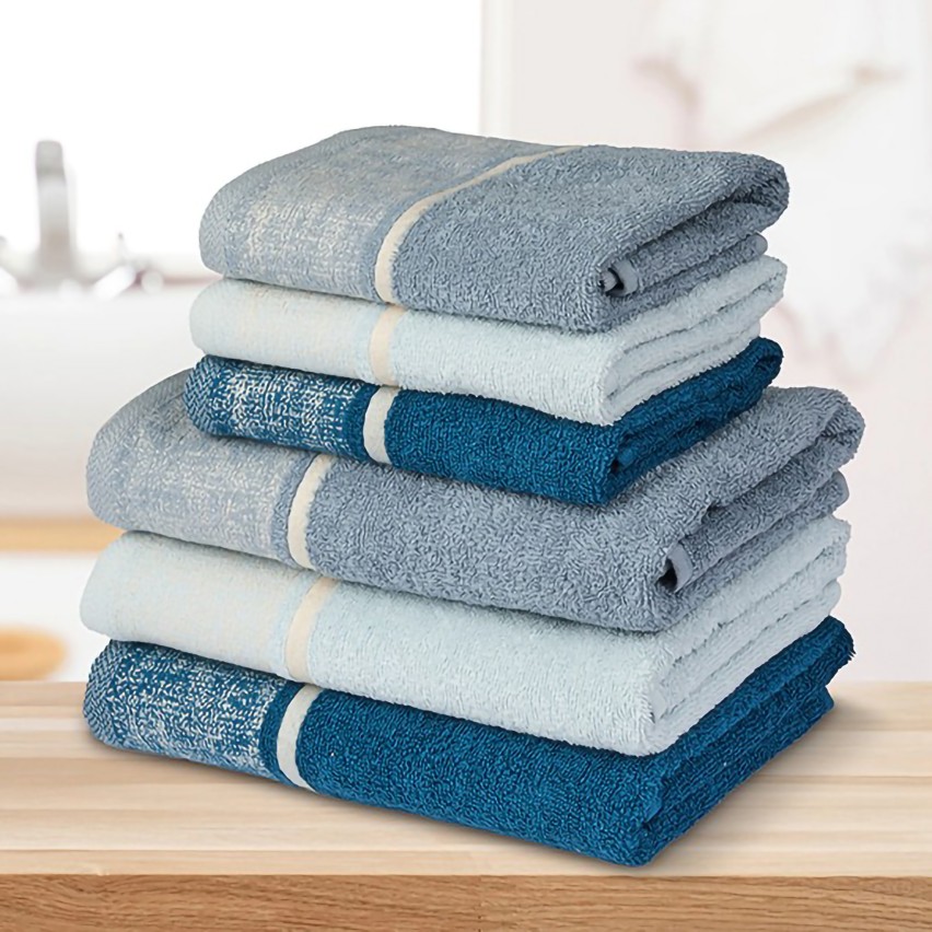 Il set è composto da 3 asciugamani viso e 3 asciugamani ospite, realizzati in spugna di puro cotone 100%, nota per la sua morbidezza e grande capacità assorbente.