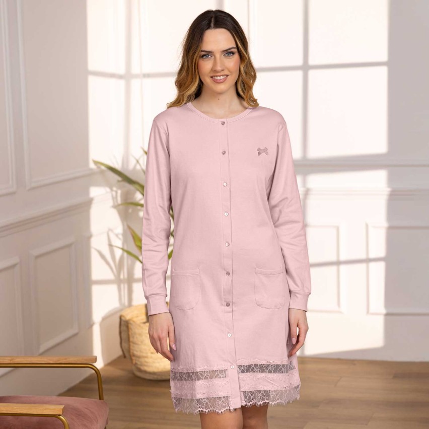 Per la massima praticitร , la camicia da notte รจ dotata di tasche frontali a marsupio, perfette per tenere a portata di mano piccoli oggetti. L'elemento piรน distintivo รจ l'applicazione di una fascia in pizzo sull'orlo, che aggiunge un tocco elegante e sensuale.