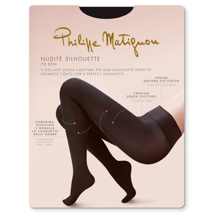 Collant Philippe Matignon Nuditè Silhouette 70den corpino senza cuciture e senza tassello modellante coprente opaco effetto ventre piatto cinturino anatomico più alto e contenitivo