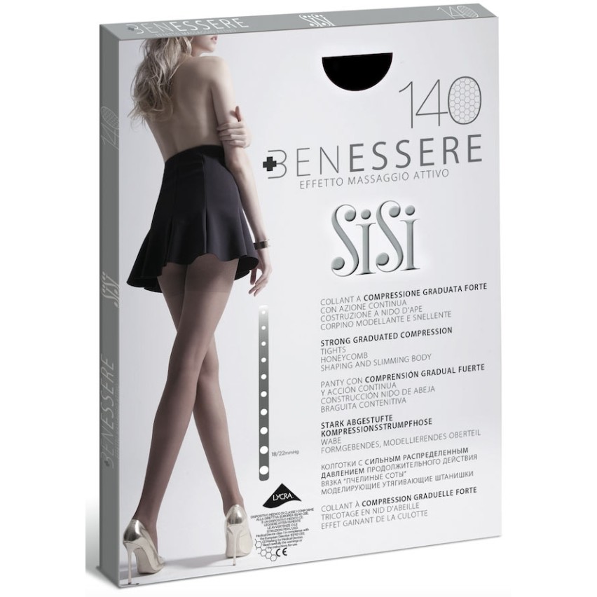 I collant Sisi Benessere 140 denari, codice articolo 814SI, rappresentano una soluzione avanzata per coloro che cercano sollievo e benessere per le gambe affaticate e doloranti, offrono una compressione graduata forte, con azione continua, che si rivela particolarmente efficace nel trattamento dei sintomi di insufficienza venosa.