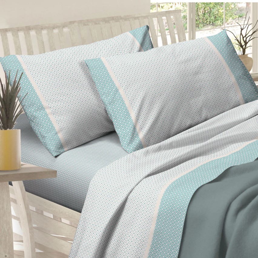 Realizzato in 100% cotone anallergico con un trattamento ultra soffice, offre una piacevole sensazione di freschezza e delicatezza sulla pelle. La fantasia a rombi in tonalità acqua marina, panna e dettagli grigi aggiunge un tocco elegante e moderno alla tua camera da letto.