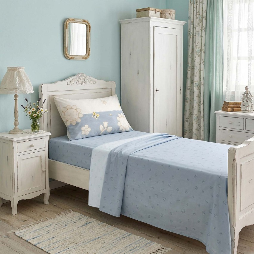 Lenzuolo Sopra (155x290 cm): Color celeste chiaro con una delicata fantasia soft tono su tono di soli, farfalline e fiori.