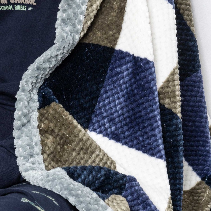 Questa coperta è realizzata in morbido tessuto coral, un materiale che unisce una texture incredibilmente piacevole al tatto a un calore superiore. La lavorazione dettagliata crea un bellissimo e moderno motivo a quadri che alterna con eleganza tonalità di colore intenso: il blu navy, il grigio e il bianco. L'alternanza dei colori conferisce alla coperta un aspetto visivo tridimensionale e una sensazione di massimo comfort.