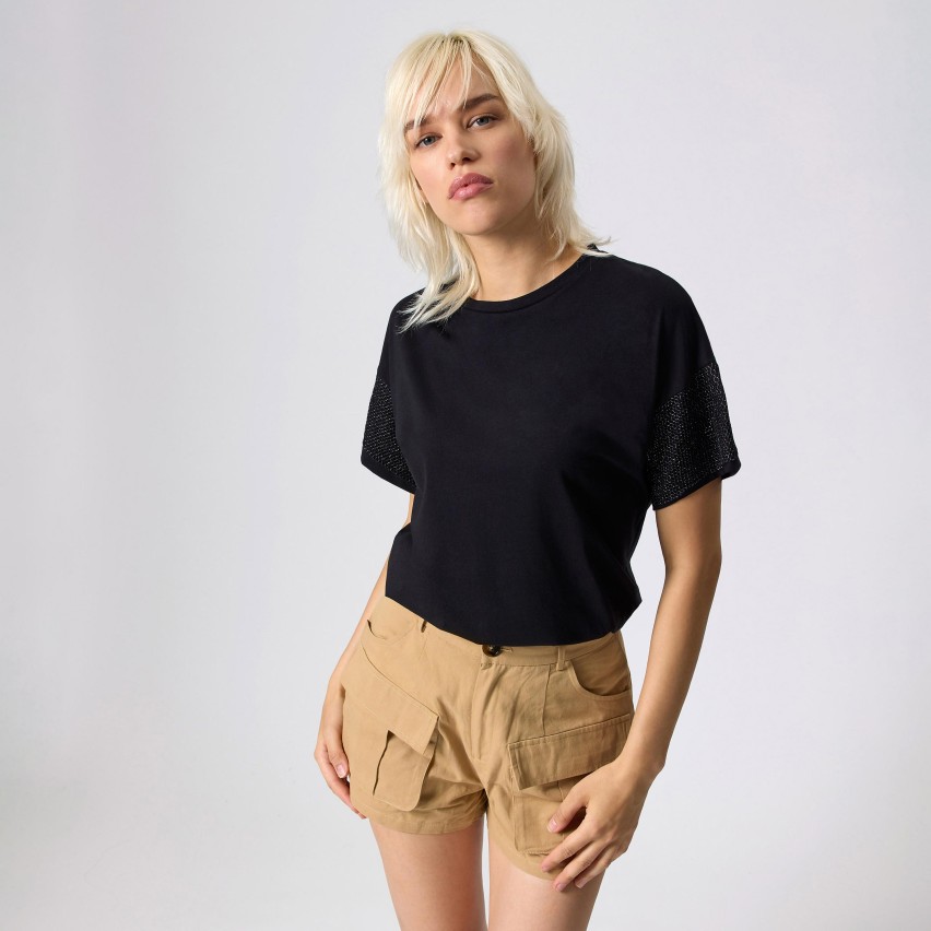 La vera protagonista della maglia è l'applicazione in rete lurex brillantinata sulla manica, che dona un tocco di glamour al design sportivo. Perfetta per chi ama un look rook, questa t-shirt è versatile e si abbina facilmente a jeans, pantaloni cargo o leggings per un outfit fresco e dinamico.