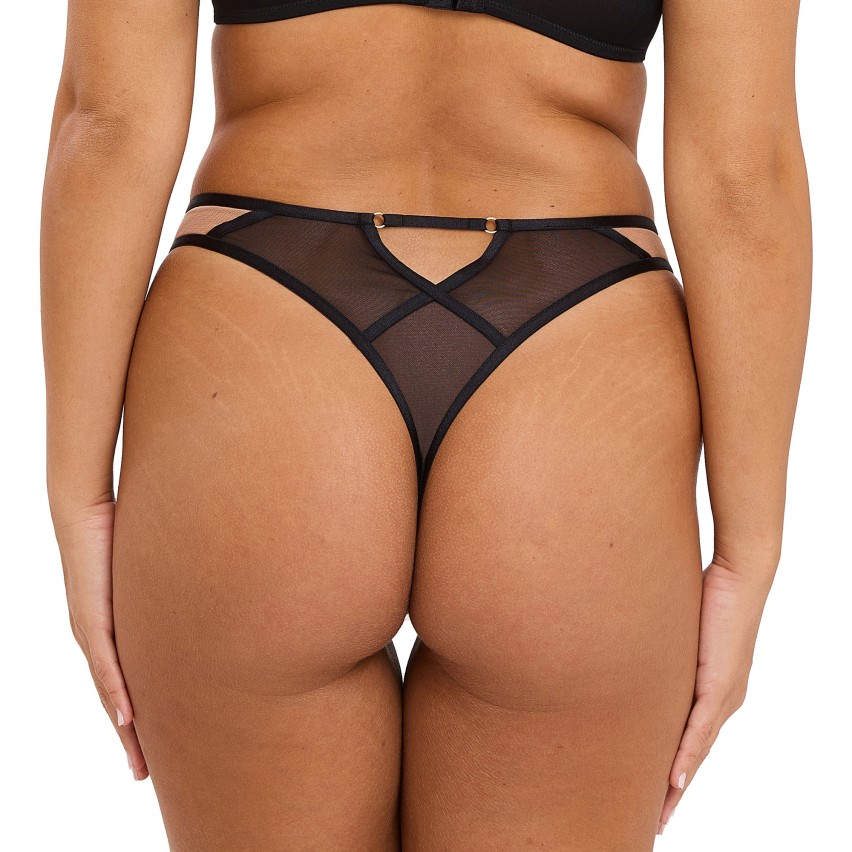 Realizzato in tulle trasparente nero, questo perizoma รจ impreziosito da delicati inserti in pizzo floreale sul davanti e da dettagli grafici in elastico che valorizzano la silhouette. Le doppie fascette laterali aggiungono un tocco sexy e moderno, perfetto per un look intrigante.