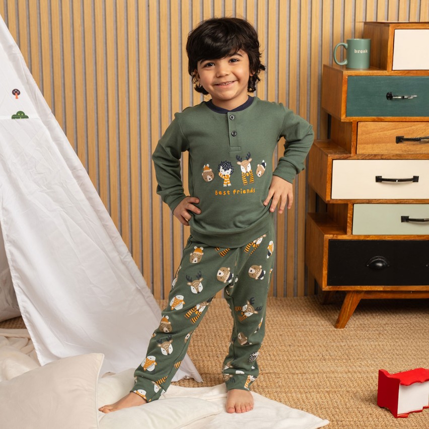 A completare il set, i pantaloni riprendono l'allegra fantasia all-over di animaletti, trasformando il pigiama in un capo giocoso e coordinato.