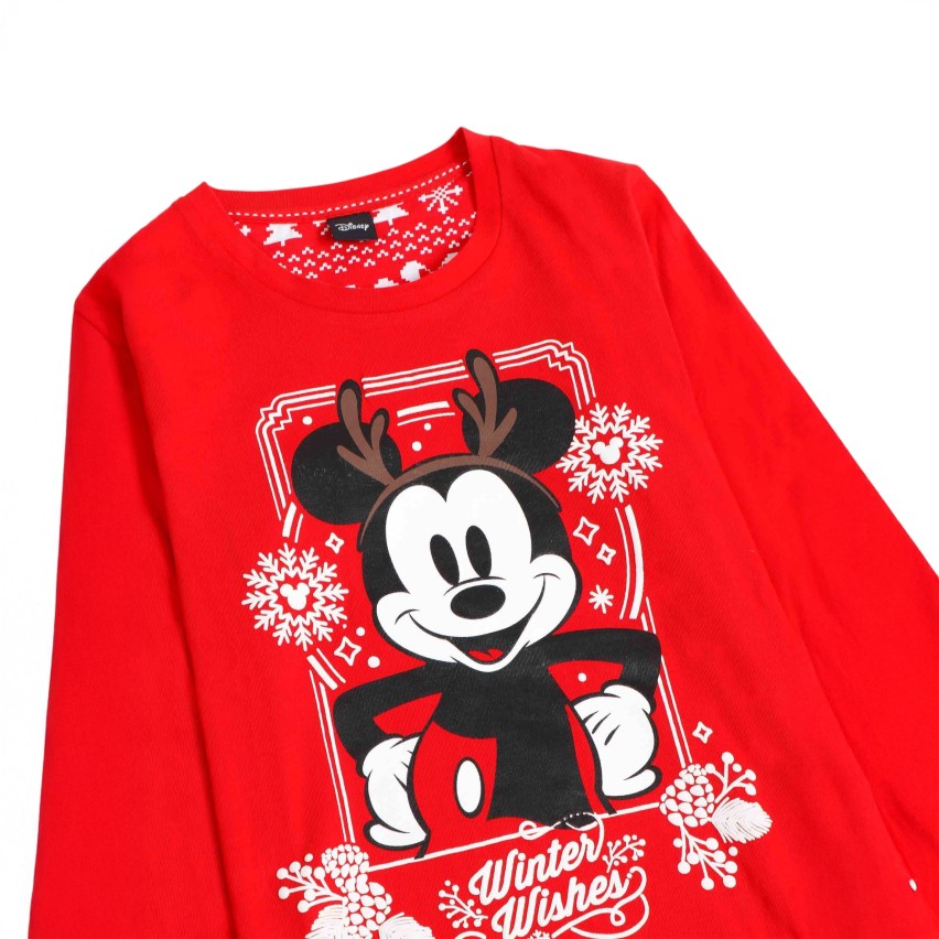 - Maglia natalizia con Topolino: stampa esclusiva di Topolino in versione natalizia su uno sfondo rosso vivace, simbolo delle feste. Il girocollo aggiunge un tocco pratico e classico.