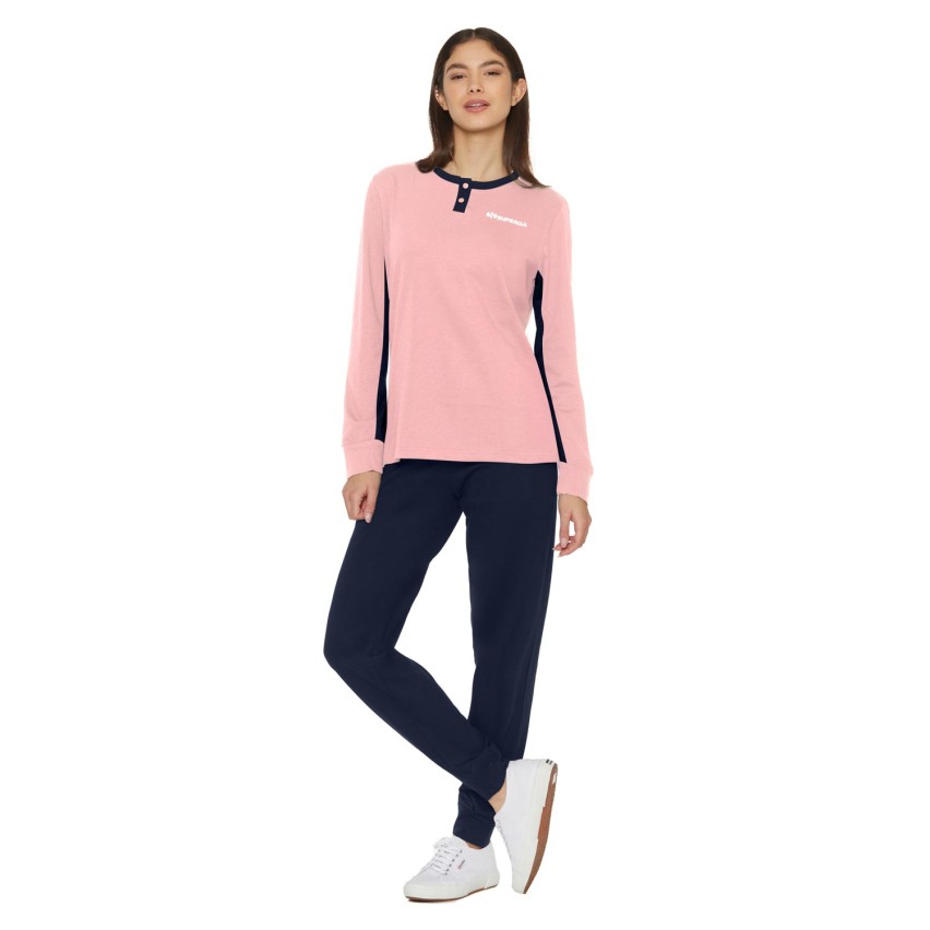Questo pigiama da donna firmato Superga è realizzato in morbido cotone garzato, ideale per offrire una piacevole sensazione sulla pelle e tenerti al caldo durante la stagione più fresca. Il tessuto interno leggermente felpato assicura comfort prolungato, senza rinunciare a un look dinamico.
