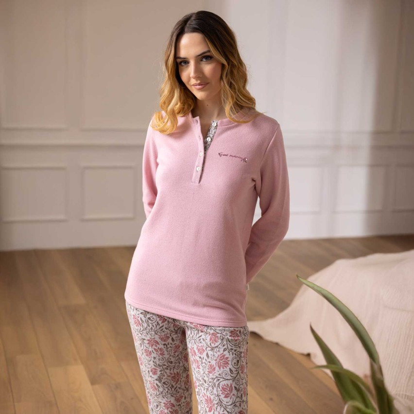 Pigiama da donna dal design raffinato e femminile, realizzato in caldissimo e morbido tessuto punto Milano, ideale per affrontare con stile e comfort le serate più fredde.