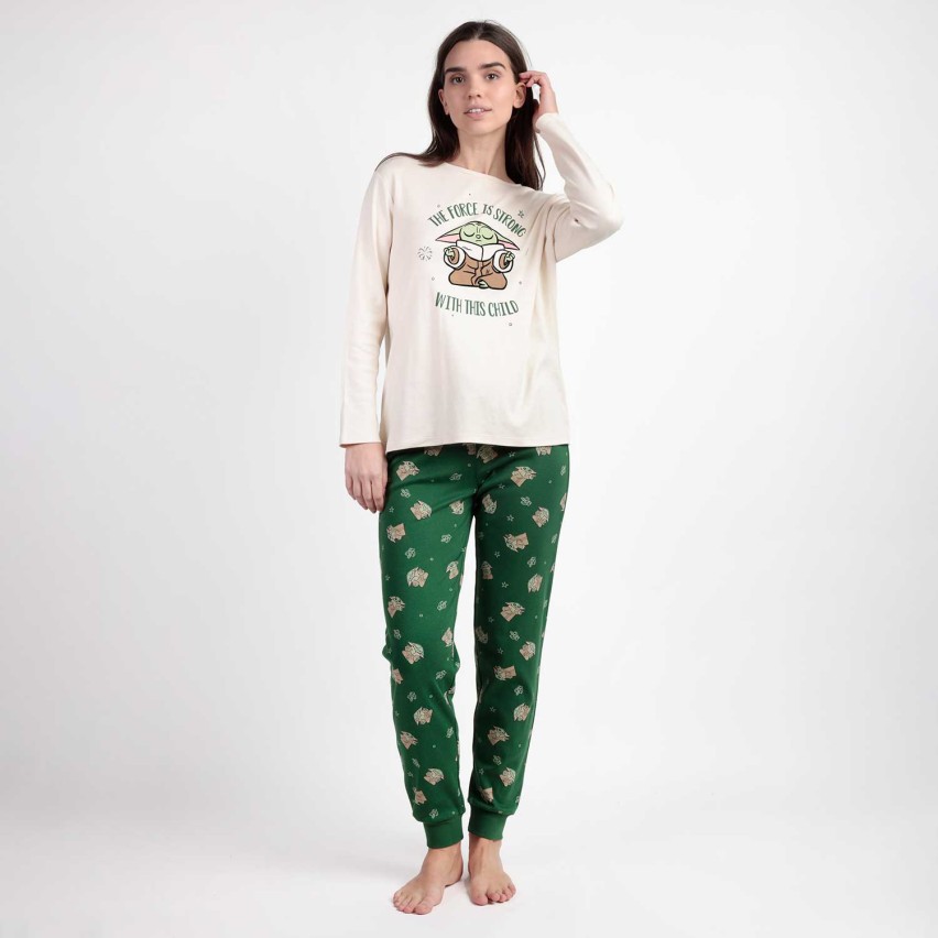 Questo pigiama da donna a manica lunga e girocollo รจ un must per le fan di Star Wars. La maglia, di colore chiaro, presenta una stampa centrale che cattura l'attenzione: Grogu, l'amato "Baby Yoda" della serie The Mandalorian, รจ raffigurato in una posa di meditazione, con le orecchie sollevate e la mano in un gesto che evoca la Forza. La stampa รจ completata dalla frase "The Force is Strong with this Child", che aggiunge un tocco iconico e divertente.