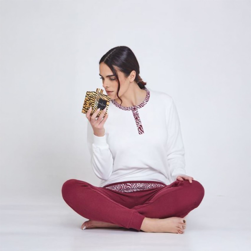 Il completo è bilanciato dal pantalone, essenziale e versatile nella sua tinta unita, pensato per esaltare la raffinatezza della maglia. Il massimo del comfort è assicurato dal pratico elastico in vita, che si adatta senza stringere, e dal polsino sul fondo, un dettaglio funzionale che modella la silhouette e mantiene la temperatura corporea ideale per tutta la notte.