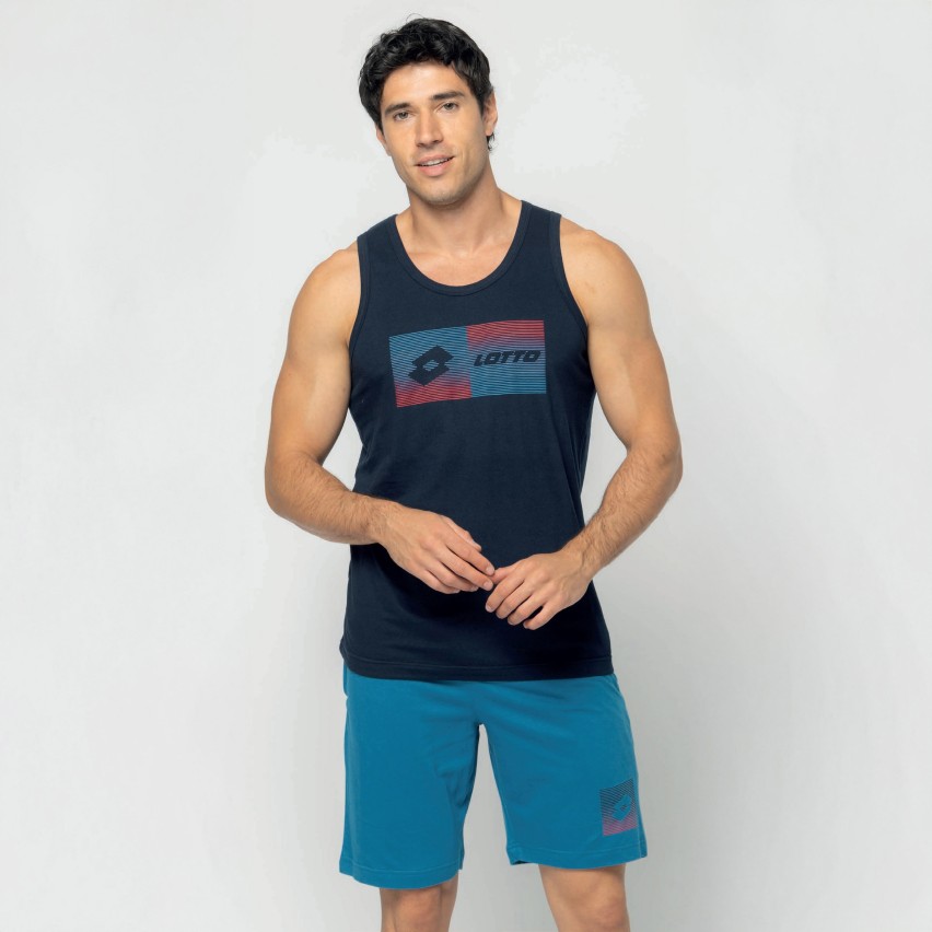 La canotta a spalla larga è impreziosita da una stampa colorata con logo centrale, perfetta per un look giovane e dinamico. Il pantaloncino corto, con vita elasticizzata e comode tasche laterali, è completato dal logo Lotto sul fondo gamba, per un tocco di stile inconfondibile.