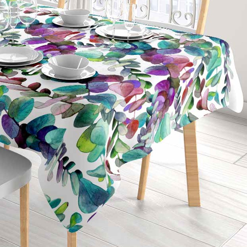 La tovaglia Zambaiti – collezione Spotty, stampa Folf è una vera opera d’arte tessile. La fantasia, realizzata in stampa digitale ad altissima definizione, riproduce eleganti rami di foglie di eucalipto acquerellate in un mix di colori vibranti e sfumature moderne: verde bosco, smeraldo, turchese, ametista, viola intenso, blu notte e accenti di rosso ruggine e rosa ciclamino.