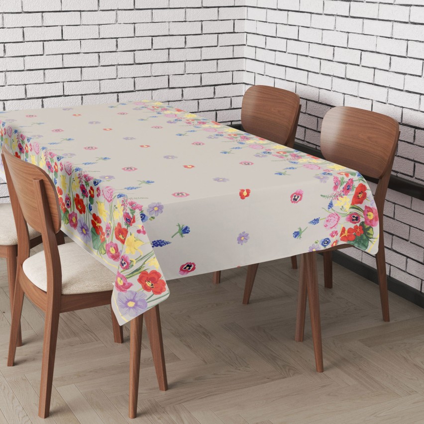 Tovaglia fantasia fiorata coloratissima Preziosa rasatello Thango, su sfondo beige chiarissimo.