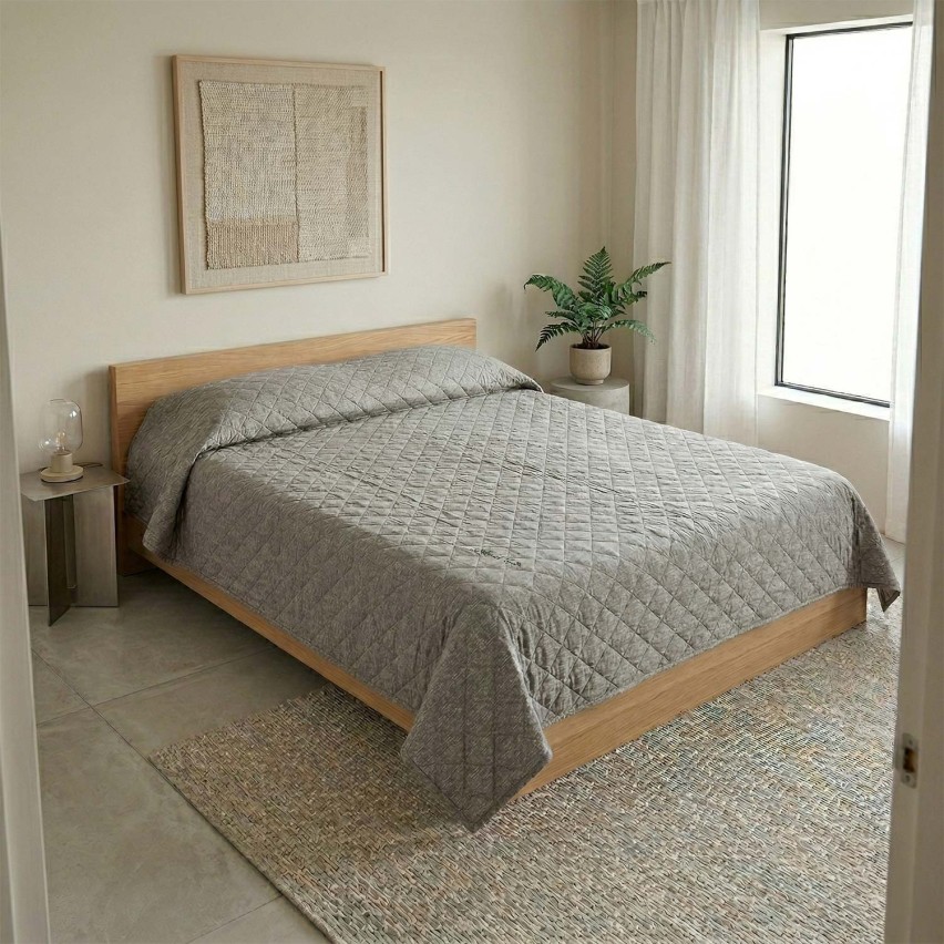 La fantasia si presenta come un raffinato "falso unito" con effetto melangiato: una trama fitta che simula l'intreccio dei tessuti naturali in una tonalità di grigio antracite estremamente versatile. La trapuntatura a piccoli rombi non solo dona struttura al copriletto, ma crea un gioco di luci e ombre che valorizza la superficie materica, rendendolo perfetto per chi cerca un’estetica "pulita" ma di grande carattere. Il design sobrio e i colori neutri lo rendono un pezzo jolly, capace di integrarsi perfettamente in ogni tipo di arredamento, dal moderno allo scandinavo, aggiungendo un senso di ordine e calma.