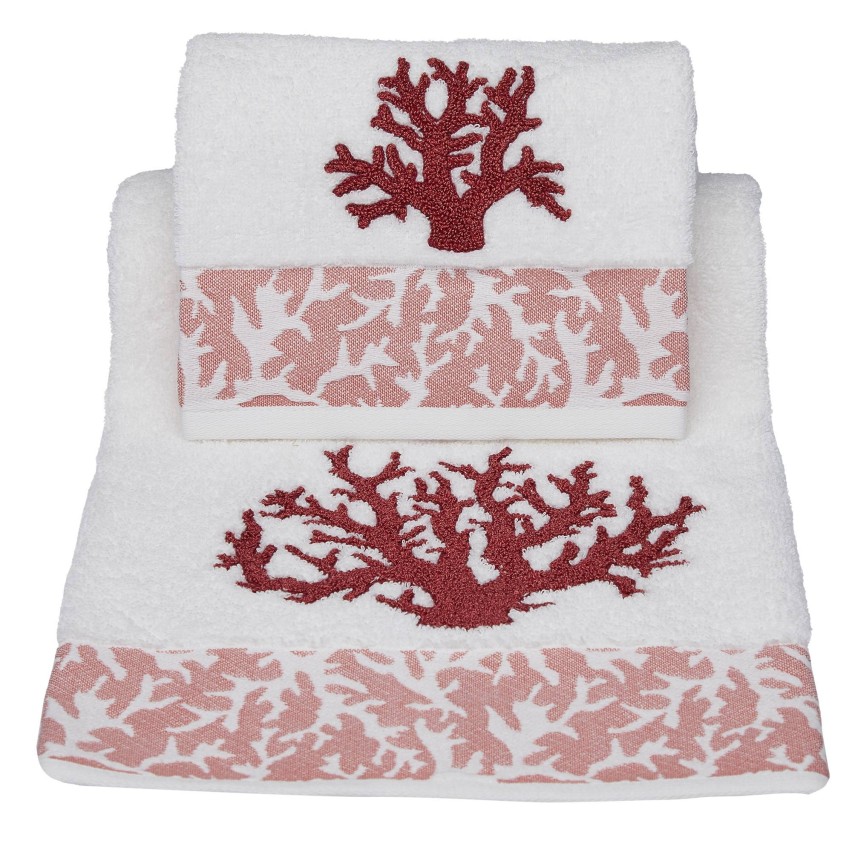 Vingi set asciugamani viso e ospite Paros bianco con ricamo color corallo di un delicato corallo