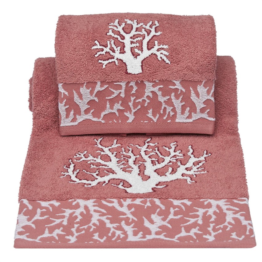 Vingi set asciugamani viso e ospite Paros color corallo con ricamo bianco di un delicato corallo