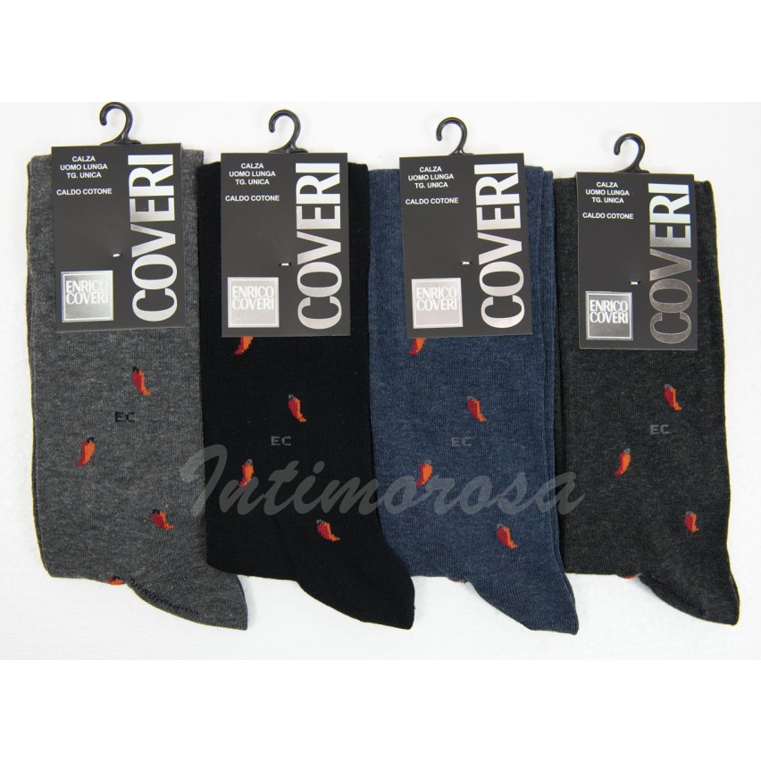 4 paia di calze da uomo lunghe, in caldo cotone, marca Enrico Coveri, colori assortiti, modello moda con piccoli peperoncini.